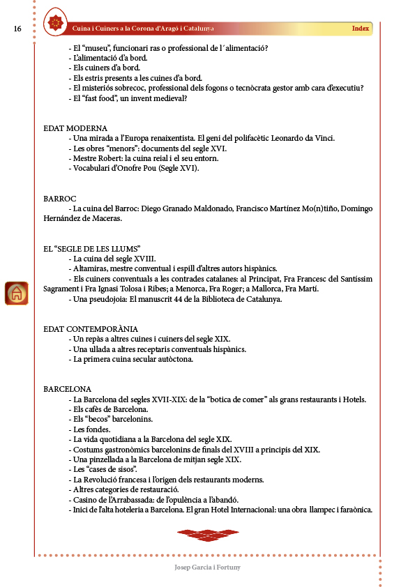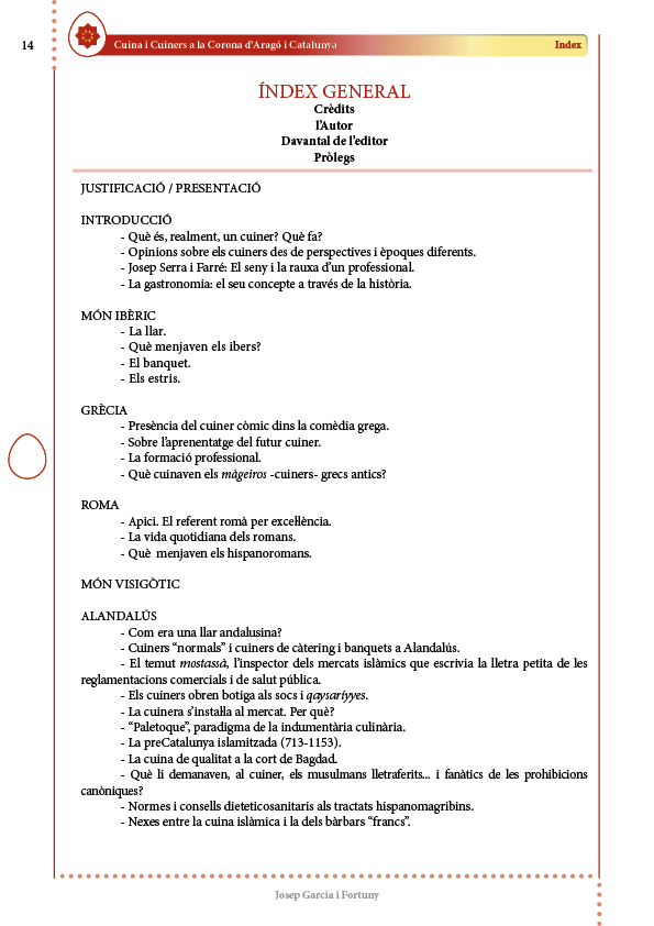 A través de la documentació més exhaustiva que s’ha pogut aconseguir, s’ha intentat d’esbossar la trajectòria d’aquells que han servit la societat tot manipulant els aliments que tenien al seu abast. I això inclou des dels camperols més humils, passant pels servidors de l’Església i de les classes benestants, fins als moderns caps de cuina que han assolit un lloc de privilegi en els cercles mediàtics contemporanis.